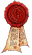 Изображает единственный череп, оплетенный имперским гербовым веленевым свитком, в равной мере символизирующем и закон Администратума, и куда более приземленный список, опись спасенных ценностей.